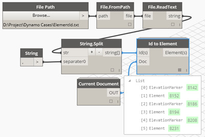 如果我們由一組用逗號分隔的ID,保存在一個(gè)文本文件里,那么下面的Dynamo項(xiàng)目就可以把ID分離出來,并且取出對應(yīng)的項(xiàng)目中的圖元。
