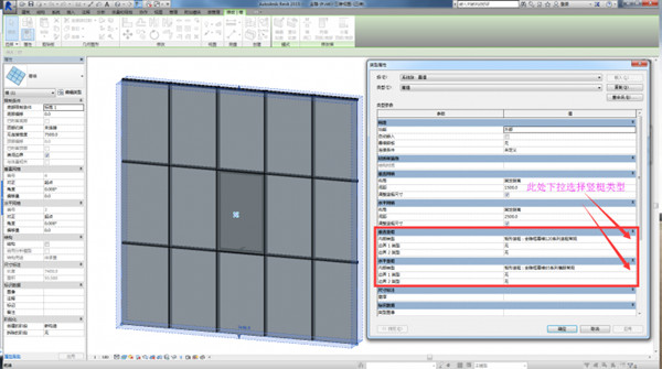 d) 在項目環境中新建一個幕墻,選擇幕墻,在類型屬性中的垂直豎梃、水平豎梃選擇相應的豎梃類型,即完成豎梃上到幕墻的全過程。