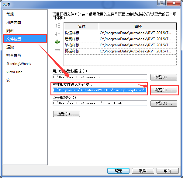 B:選擇文件位置,點擊族樣板文件默認路徑后面的瀏覽按鈕,然后選擇C:ProgramDataAutodeskRVT 2016Family TemplatesChinese這個路徑。