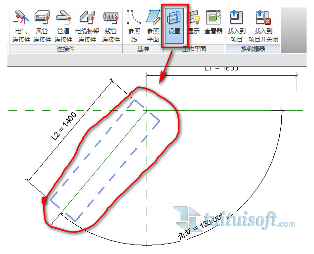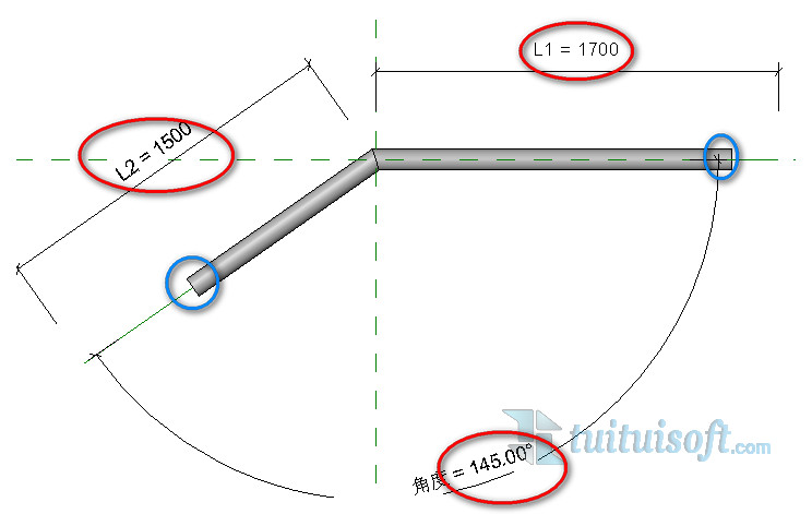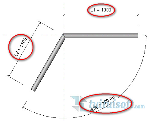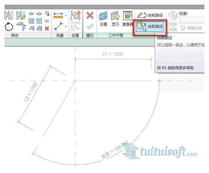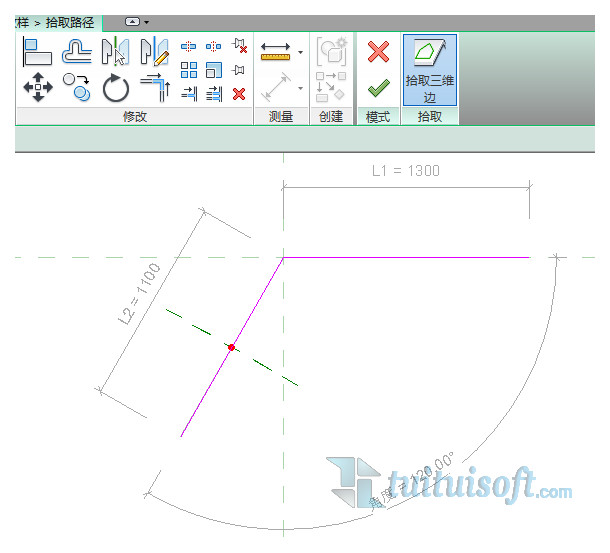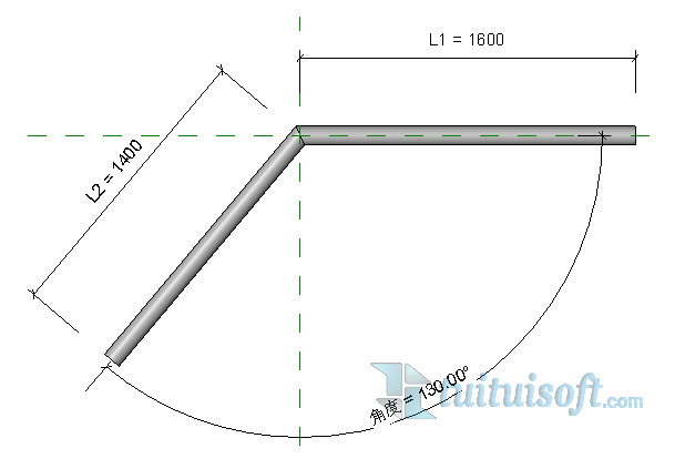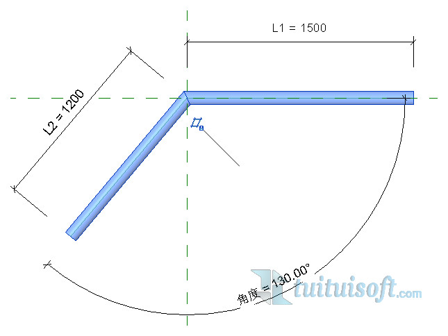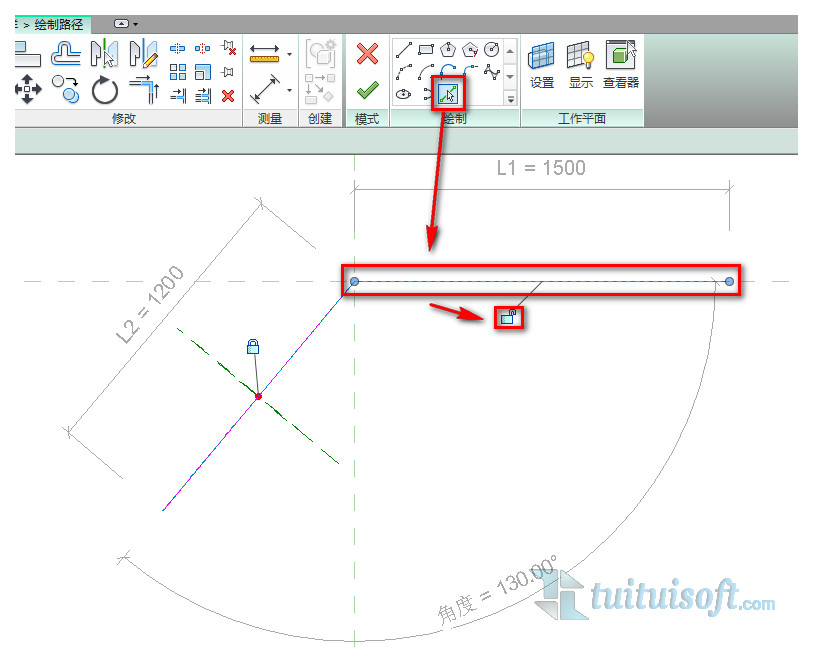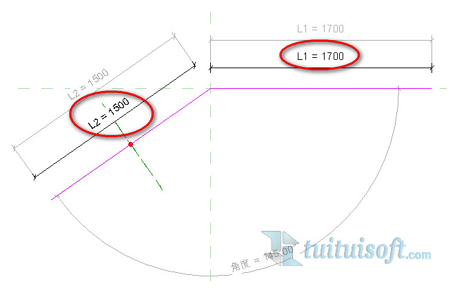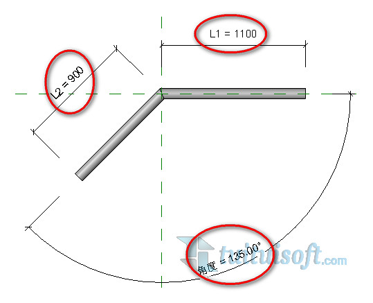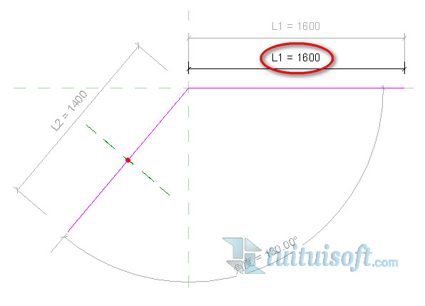 這里之所以只標注L1,是因為之前我們在設置工作平面的時候我們設置的是L2那一參照線的工作平面,所以當我們拾取鎖定L2那一段的時候,那一段的放樣路徑會和L2匹配長度,但L1不會,所以我們要進行L1段的標注。