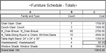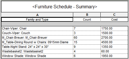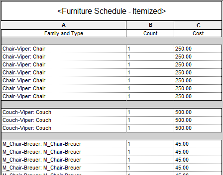 若要提供明細表中族和類型的概要(避免每個項目各自成行),請在“明細表屬性”對話框的“排序/成組”選項卡上,使用以下設置: