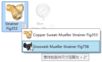 如果單擊箭頭,下拉列表將顯示基于尺寸的其他構件。 此下拉列表由服務定義中的條件控制,類似于布管系統配置。 例如,彎頭可使用達到特定尺寸的壓制彎頭和超過此尺寸的分段彎頭。將光標放置在列表中的構件上時,工具提示將顯示基于此構件條件的尺寸范圍。