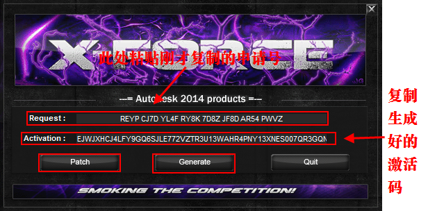 下圖中,使用Ctrl+V 粘貼申請號;粘貼完成以后,先選擇“Patch”選項,然后再選擇“Generate”生成激活碼