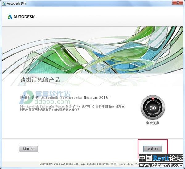 9、打開桌面上生成的navisworks 2016圖標(biāo),彈出試用30天的產(chǎn)品提示,在這里選擇激活按紐;