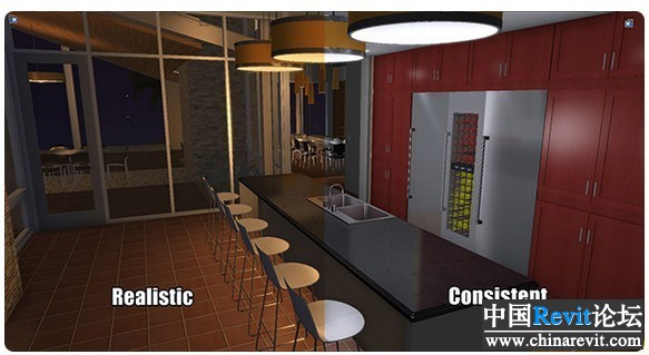 現實的和一致的渲染模式使用的Revit材質和燈光渲染信息的3D場景的時候。兩者之間的區別是,一致的渲染模式不會在照明用的溫度。所有在一致的燈光渲染模式下,即使太陽光看起來為白光。現實呈現模式將允許的光的溫度上顯示的材料。