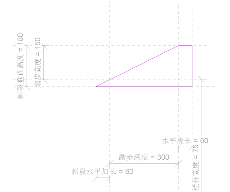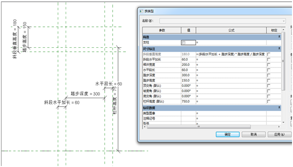 2、轉到左立面視圖中,創建如下幾條參照平面,添加參數,并對斜段垂直高度添加一個公式:(斜段水平加長+踏步深度)*踏步高度/踏步深度。