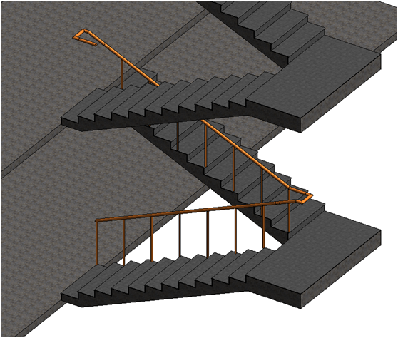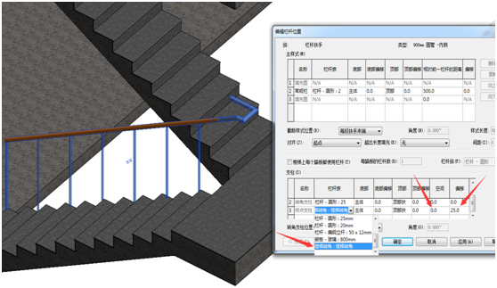 8、選擇欄桿扶手→放置在主體上,這是選擇900mm圓管,放置在樓梯上,并將內側重疊的欄桿刪除。完成后效果圖如下:
