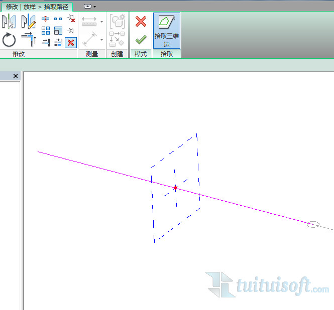 2、設置參照平面為工作平面并轉到三維視圖中,在創建選項卡中選擇參照線,用拾取線的方法拾取剛才繪制的參照平面。