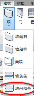 4、將輪廓族保存并載入到項目中,在建筑選項卡中選擇墻:分隔條,并將分割條放置在墻體上