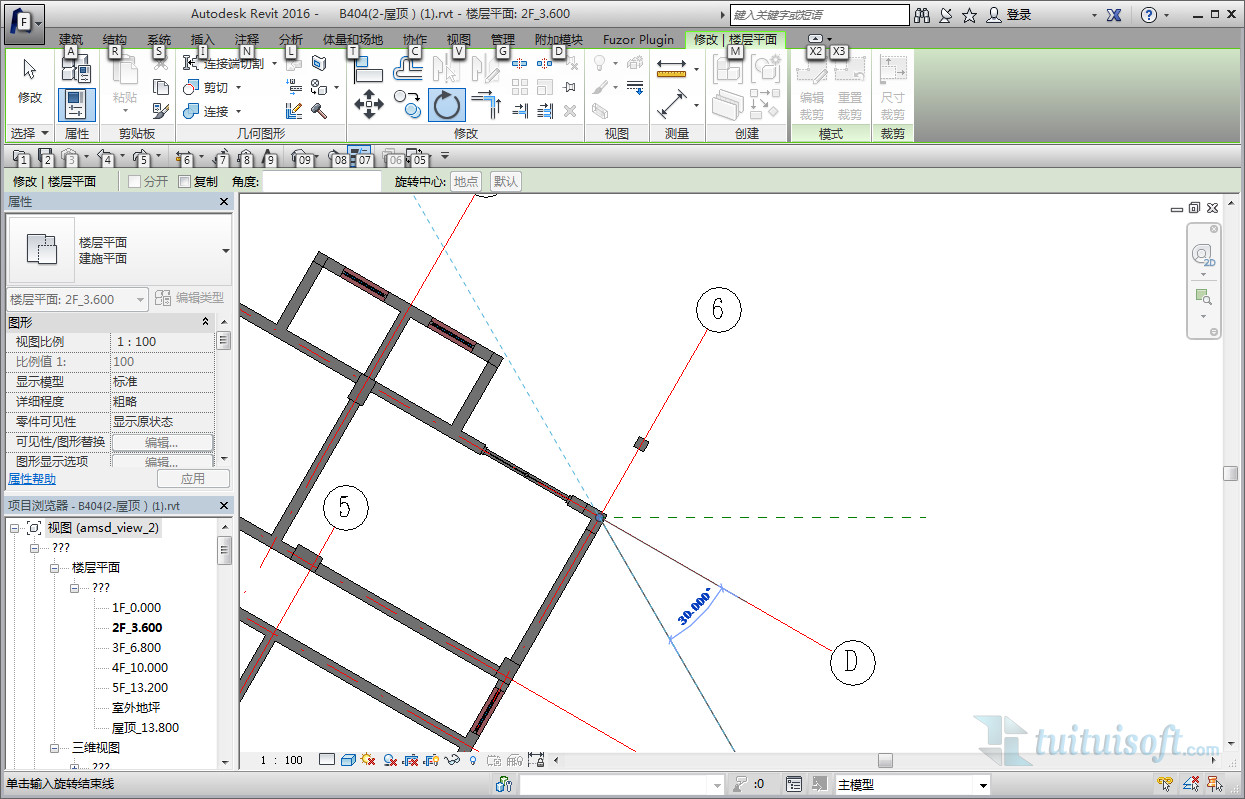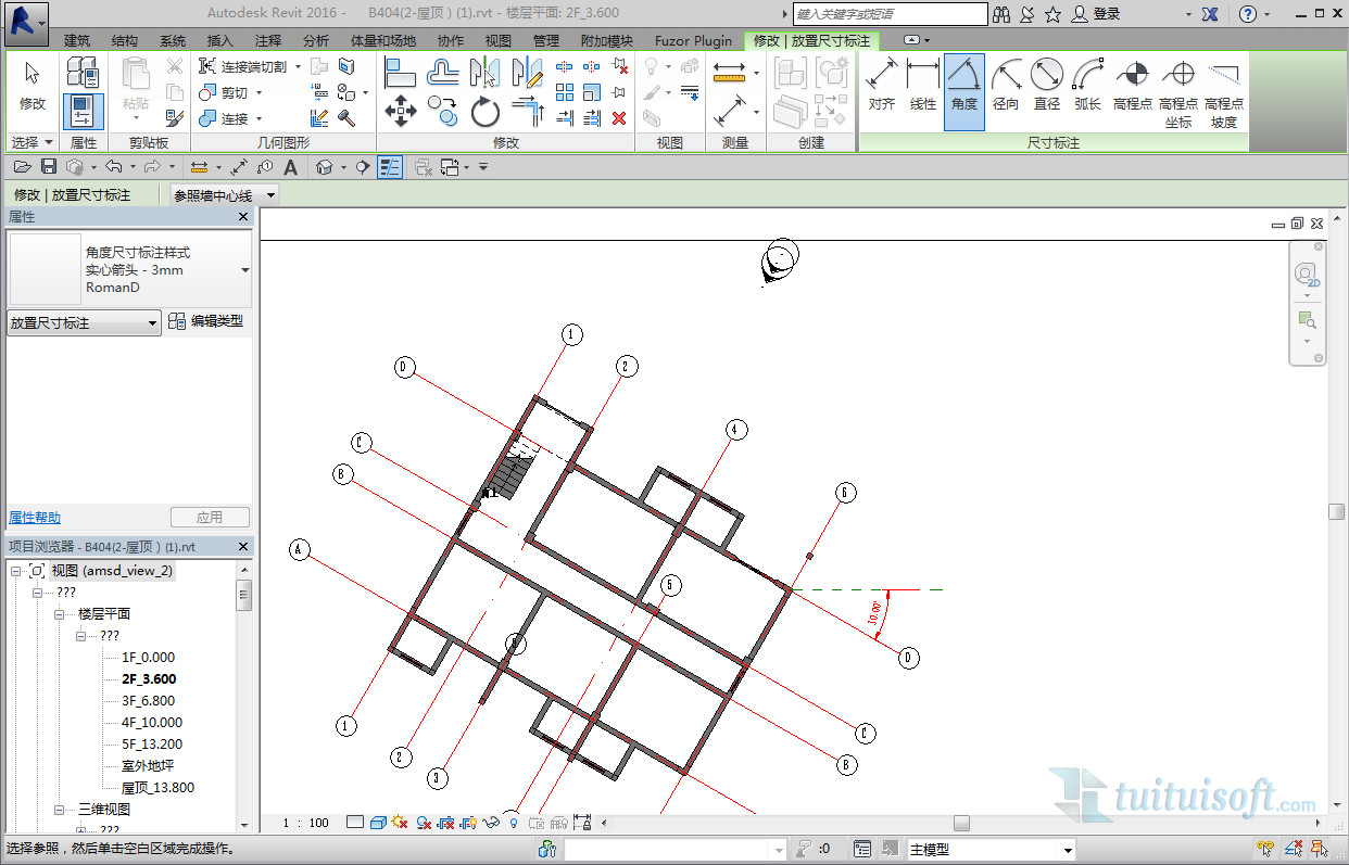出現矩形框,先添加一參照平面,測量要移動的軸網與參照平面之間的角度。