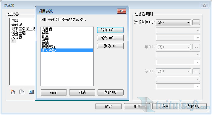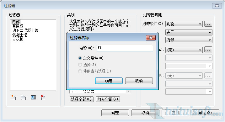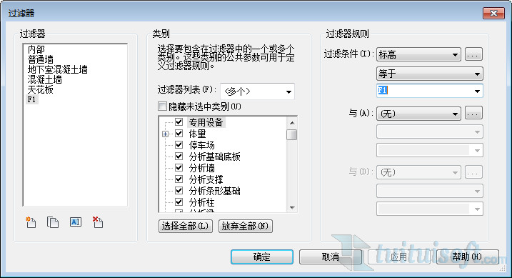 新建完過濾條件之后,就可以在過濾條件下拉選框中選擇更多參數,將新添加的“標高”選擇進來。并將條件設置為“等于”、“F1”。