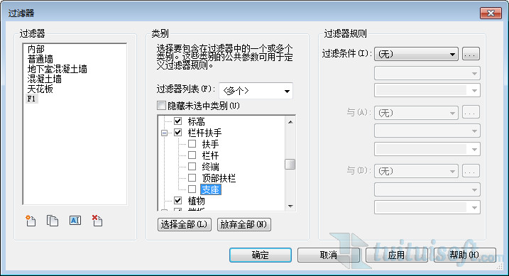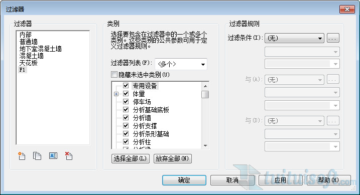 在類別中選擇過濾器需要應用的對象。因為我們建的一般為建筑結構模型,所以選擇這兩項,在下方單擊選擇全部。