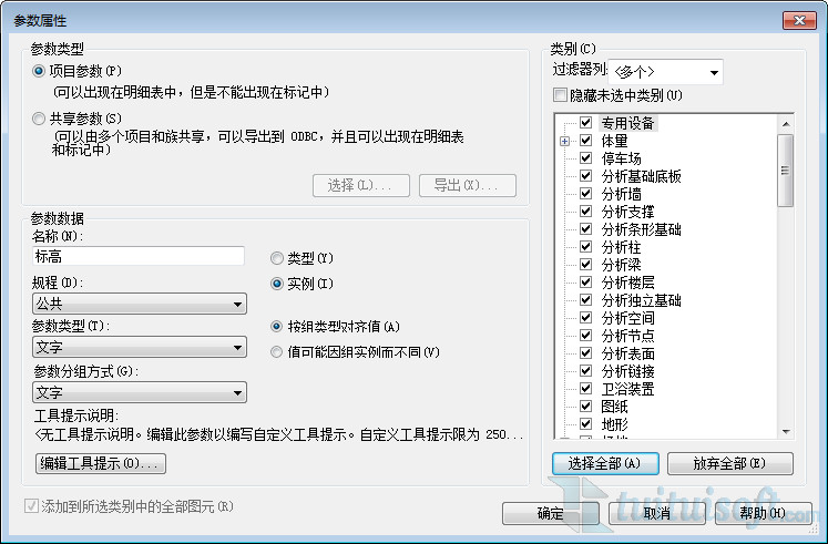 修改名稱為“標高”,參數類型為“文字”,并在右側類別中選擇全部。