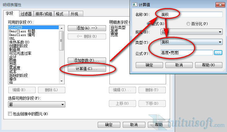 三、接著最重要的一步就來了!打開字段中間的“計算值”,名稱輸入“面積”,并且將“類型”改為“面積”,在最下面一行的公式里輸入面積的計算公式:高度*寬度,點擊確定,確定,做到這里就已經大功告成了!看文字太累的可以直接看下圖,一目了然~