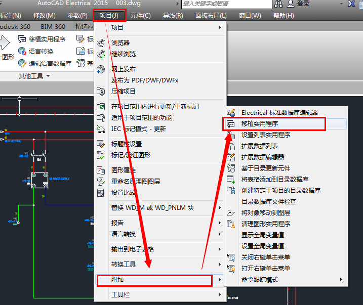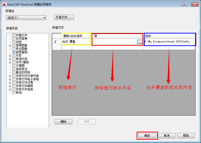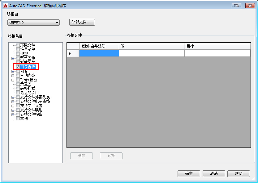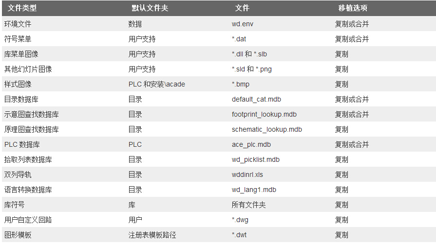 注: 這些是 Autodesk AutoCAD Electrical 2015 之前版本的默認文件夾。文件將被移植到當前文件夾結構。 有兩個移植選項,具體取決于文件類型。