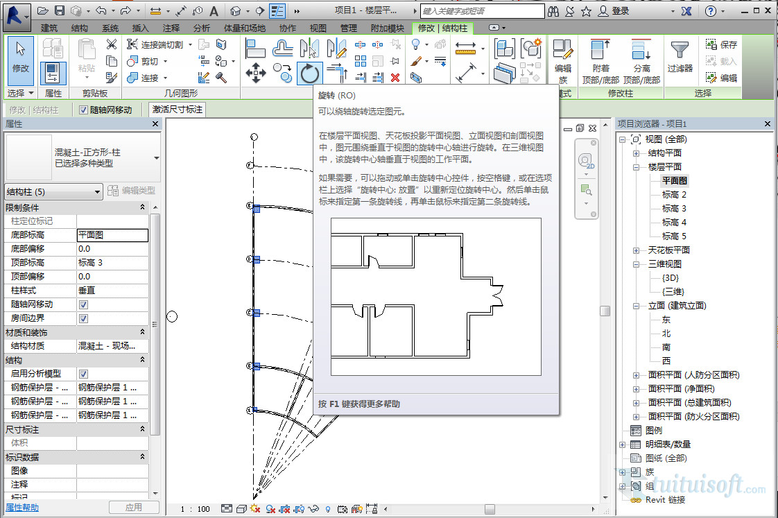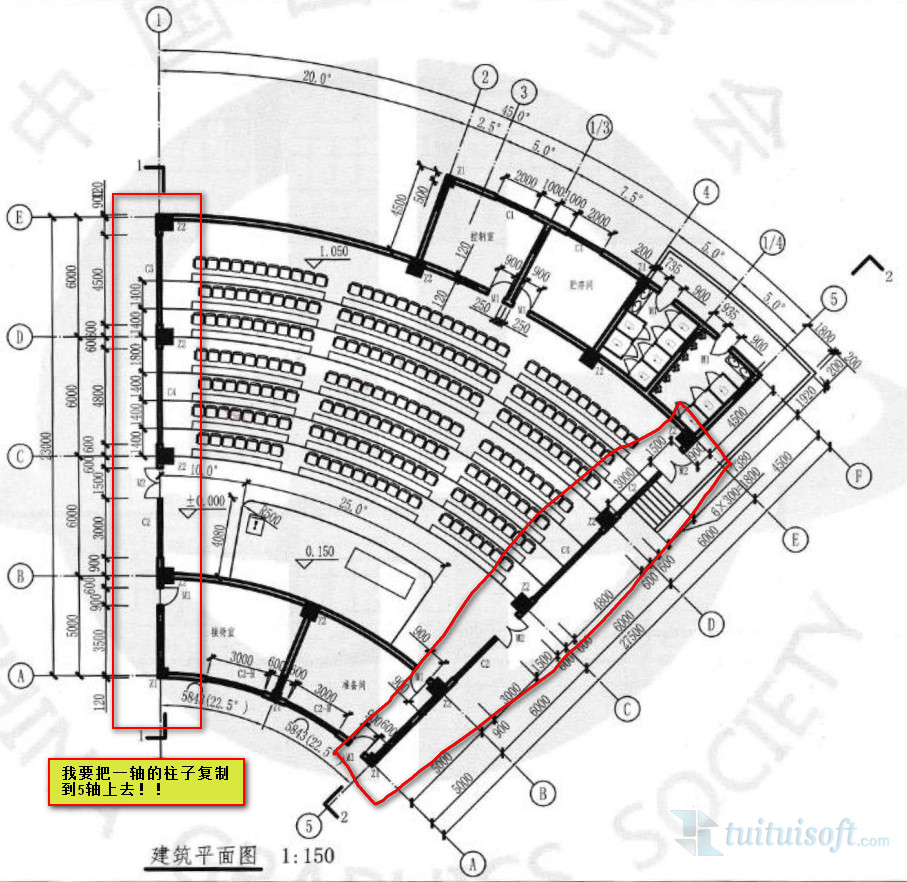 我要做的就是呢就是畫出5軸的柱子(截圖軟件居然不可以對框進行旋轉,真是大Bug 啊,請忽略我畫出來的彎彎扭扭的線),可是,我是誰啊,COCO啊,我這么懶肯定不愿意一個一個重新畫啊(你肯定又要想了,直接用鏡像不就行了,可是我笨啊,當時沒想到啊)所以,就發現了旋轉的奧秘咯!