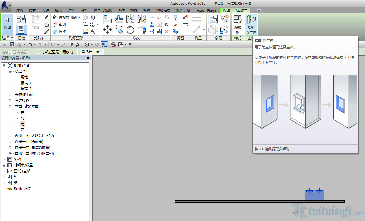 2.在剖面視圖或立面視圖中,選擇基于標高的構件。單擊修改選項卡,選擇“拾取新主體”命令。