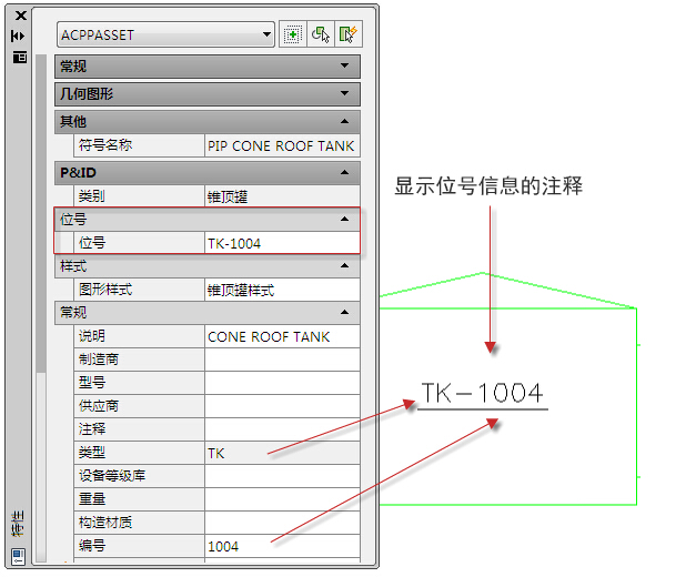 在下面,您可以將位號視為左側“特性”選項板中和右側圖形的注釋中的數據: