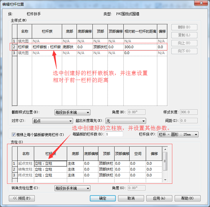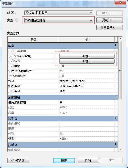 新建項目,將創建好的“扶欄輪廓”、“立柱”、“欄桿嵌板”族載入到項目中。選擇“欄桿扶手/繪制路徑”命令,打開類型屬性對話框如下設置。