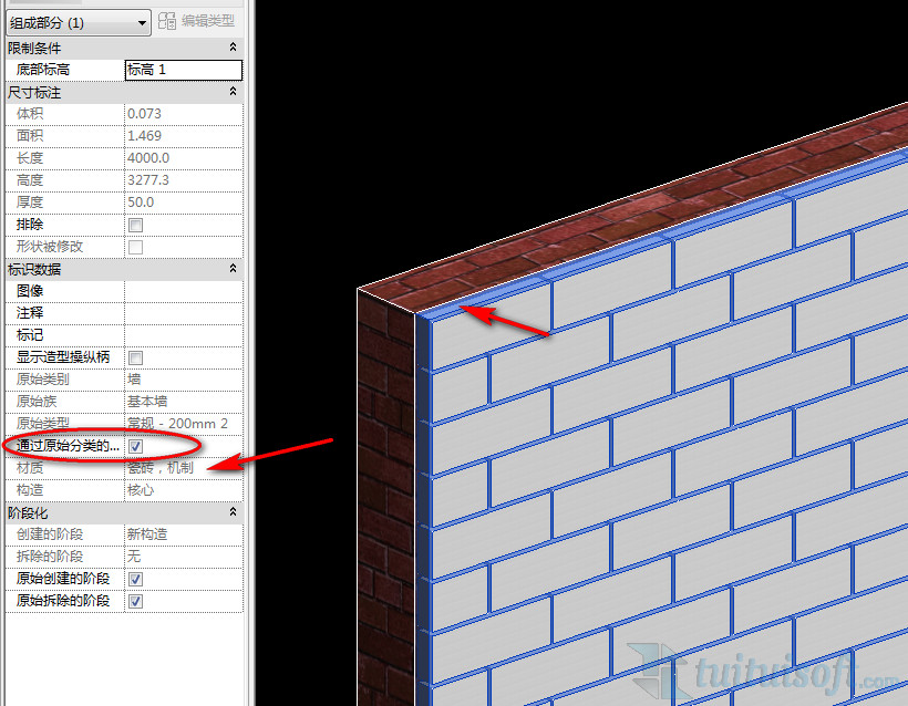 四、選擇下圖亮顯部分,這個地方實際上就是灰縫,在實例屬性面板中將“通過原始分類的材質”取消勾選,這樣就能修改它的材質了!可以創建一個黑色的材質用來表示灰縫