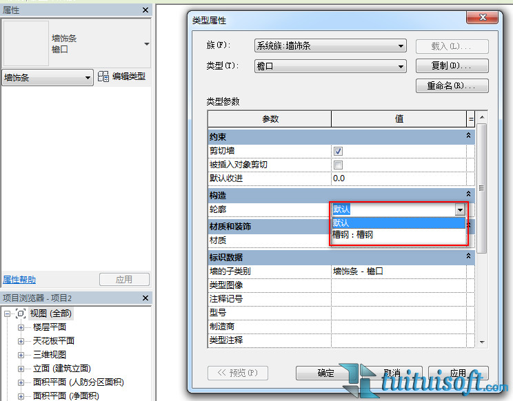 首先,我們打開墻飾條,大家可以發現在編輯類型在是無法添加輪廓的(注意:墻飾條只能在立面和三維視圖中打開)