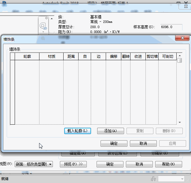 這時候我們要先創建一面墻,然后打開結構編輯,要注意的是預覽的時候要將視圖調到剖面才能進行墻飾條輪廓的添加