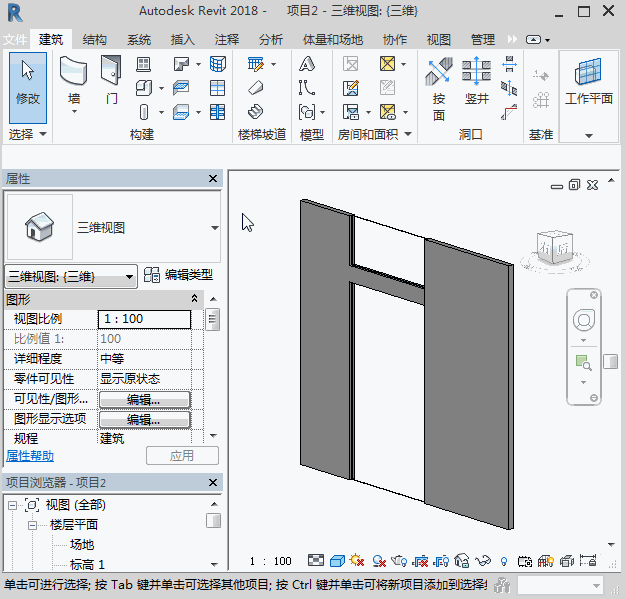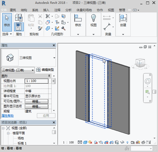 首先,我們要將幕墻進行拆分,把需要進行墻飾條放置的部分拆分出來,并將墻類型修改成普通墻