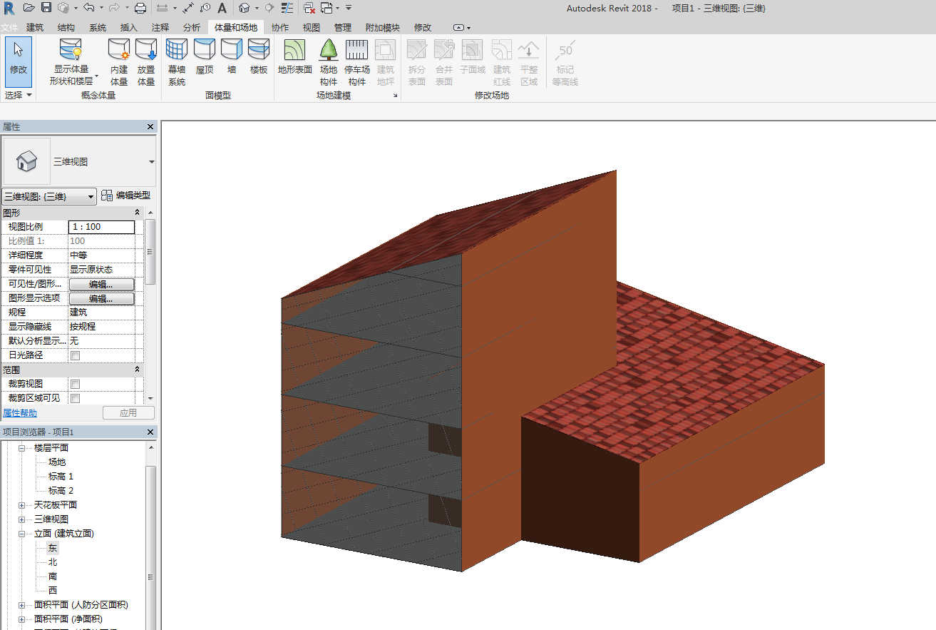 然后,通過體量和場地下的子面板,我們就可以在這個體量文件上面添加屋頂,墻面,樓板,幕墻等