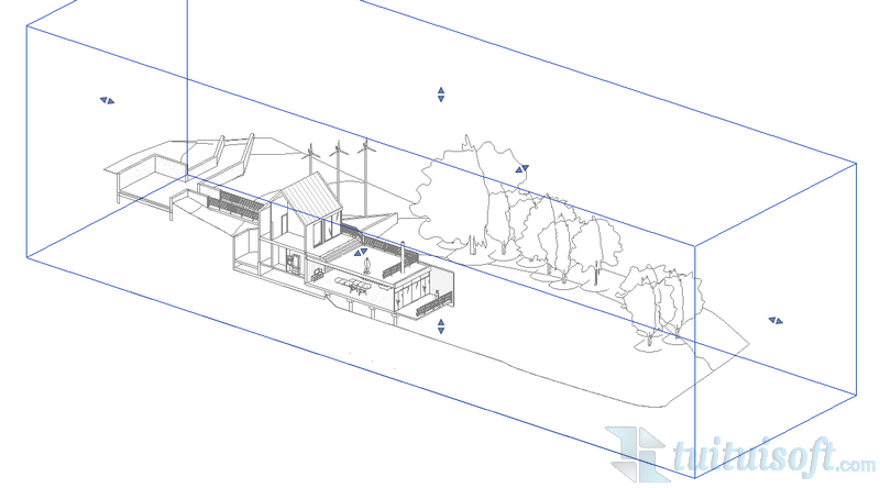 在視圖屬性瀏覽器的范圍中找到剖面框,打鉤,這時候三維視圖中就會出現一個立方框架。