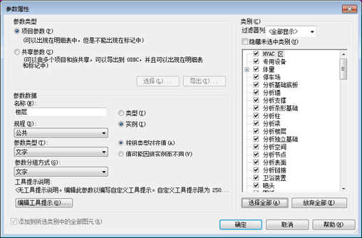 1、創(chuàng)建一個項目參數(shù),參數(shù)名稱可命名為“樓層”(記得將右邊的類別全選!)