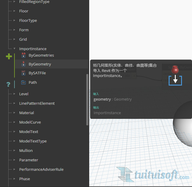 接著我們選擇Dynamo中 Revit - Elements - Importinstance 中的 ImportInstance.ByGeometry (將幾何圖形集合導(dǎo)入Revit作為一個(gè) Importinstance)