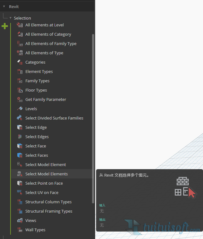 首先我們?cè)赗evit中選擇你需要載入的模型,然后在Dynamo中的 Revit - Selection - Select Model Element 選項(xiàng)