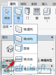 接下來把繪制好的踢腳線形狀載入項目中,在三維視圖中選擇建筑墻下拉欄中選擇“墻飾條”:
