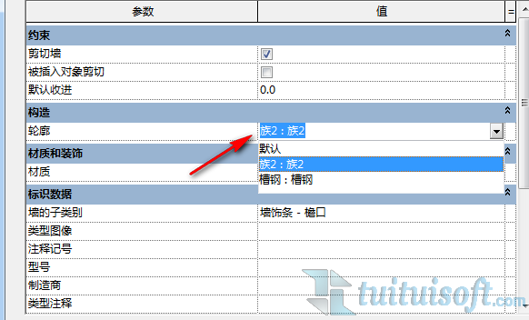 在墻飾條的屬性欄中選擇“編輯類型”里的構造中的“輪廓”中選擇之前做好的踢腳線輪廓族: