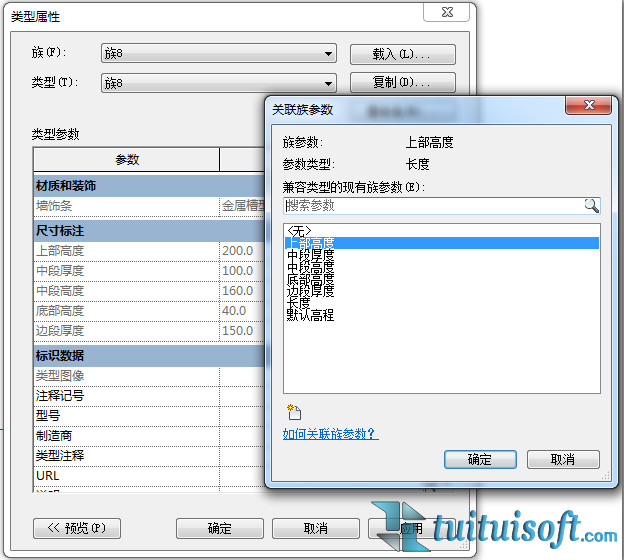 最后,將墻飾條的樣式族載入空心剪切族當中,使用【關聯族參數】對他們進行參數的嵌套