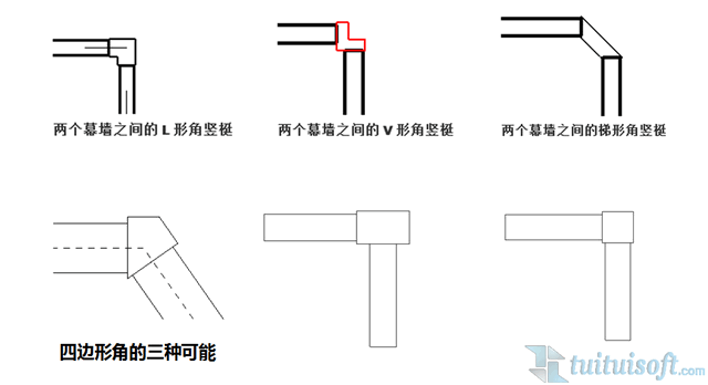 在Revit中豎挺的類型從形狀上可以分為圓形,矩形,梯形角,四邊形角,LV角這五種類型,其中圓形和矩形的輪廓可自定義,梯形角,四邊形角,LV角獨(dú)屬于角豎挺,由于轉(zhuǎn)角豎挺的輪廓會根據(jù)轉(zhuǎn)角角度變化,因此不可自定義。