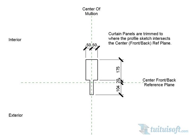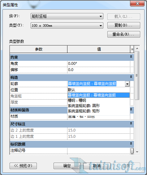雙擊創(chuàng)建的“100 x 300mm”的矩形豎,進(jìn)入類型屬性編輯窗口中,在構(gòu)造參數(shù)組中,將輪廓形狀替換成導(dǎo)入的“幕墻豎向豎挺”,單擊確定完成豎挺類型設(shè)置。