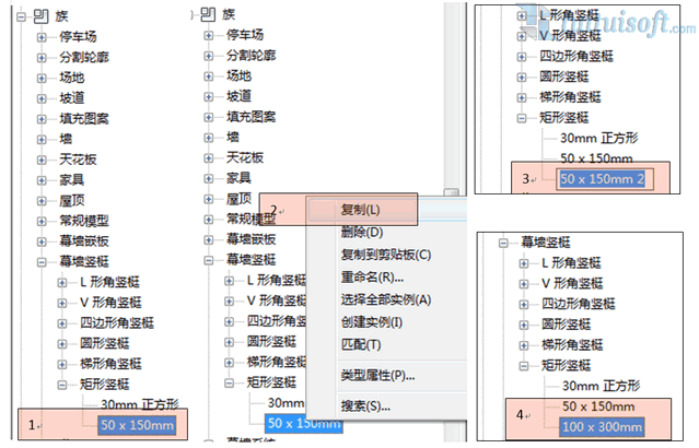 在瀏覽器面板中找到”—“幕墻豎挺”—“矩形豎挺”—“50 x 150mm”,單擊右鍵,在彈出的窗口中選擇復(fù)制,并修改新類型名稱為“100 x 300mm”。