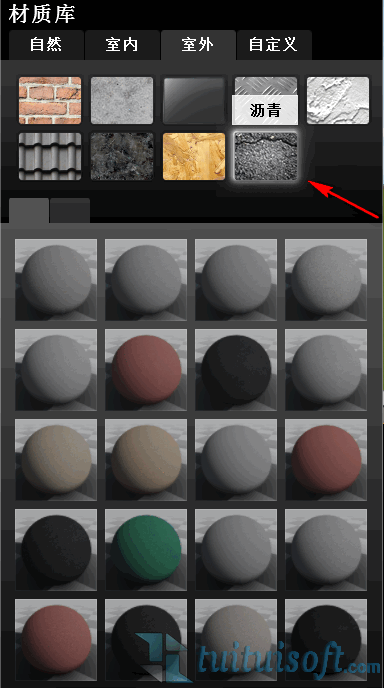 選擇在revit里繪制好的道路,接著點擊“材質庫”會彈出一個框,材質庫里包含“自然材質、室內外材質、自定義材質庫”則我們的道路屬于室外,在室外的材質庫里選擇“瀝青”材質,在瀝青的材質里包含著很多種不一樣的材質,則小編就隨便選一種顏色的材質。