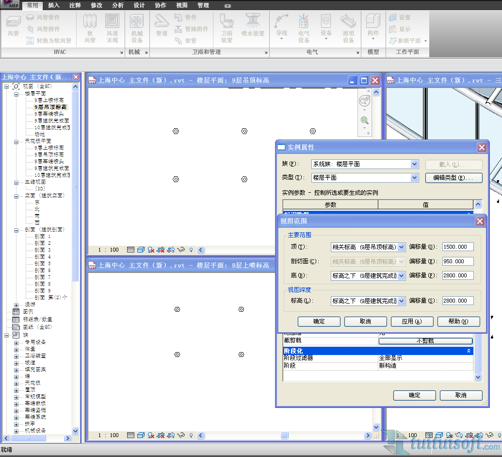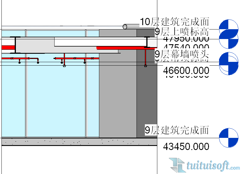 當繪制上、下噴頭時的噴淋系統:應同時為上噴頭及下噴頭分別繪制兩個參照面。在一個平面內繪制噴頭,在另一個平面中通過調整視圖屬性的視圖深度來看見前面平面噴頭的位置,在對應繪制噴頭。
