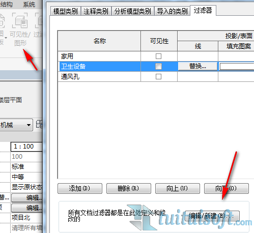 在視圖工具欄里點擊“可見性/視圖”或者輸入快捷鍵“vv”,在視圖可見性里點擊過濾器欄,在左下角點擊“編輯/新建”。