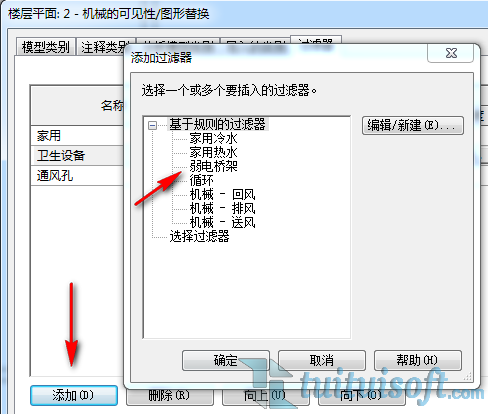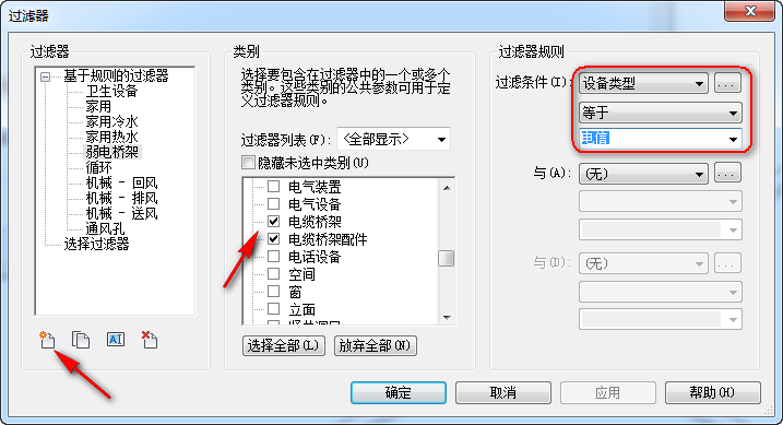 新建弱電橋架的過濾器,在過濾器列表中的隱藏未選中的類別里選擇“電纜橋架、電纜橋架配件”在過濾條件了選擇“設(shè)備類型”,在設(shè)備類型的下方選擇“等于電信”。