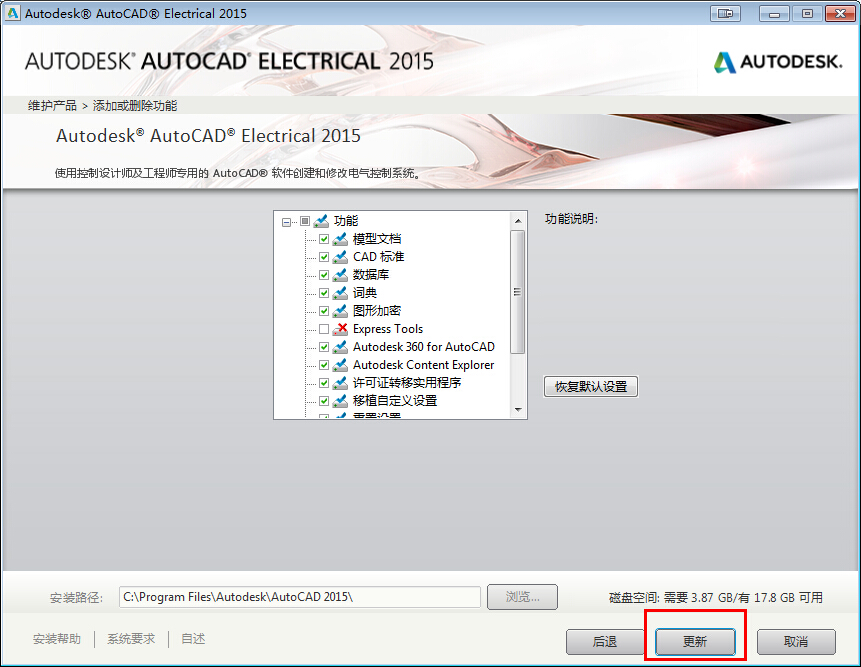 3、在“AutoCAD Electrical 安裝向?qū)А敝?,單擊“添加或刪除功能”。