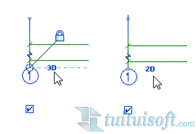 要控制不同視圖中的軸網根據視圖布置顯示,可以利用軸網的3D2D模式的切換。在項目中,軸網默認為3D模式,當單擊軸網時,軸網邊上會以藍色小字提示,如圖2所示,在3D模式下,對軸網所做的修改和調整會影響到所有視圖。