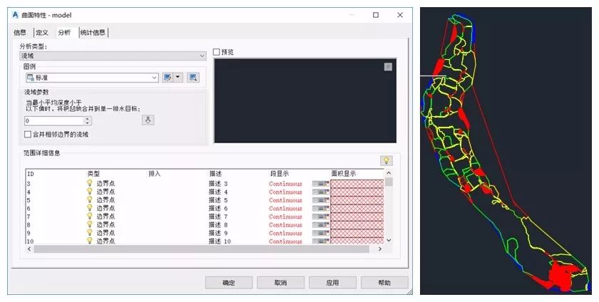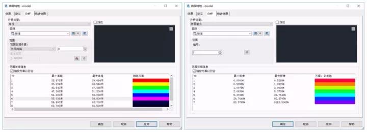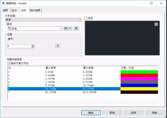 范圍編號(hào)選擇輸入,然后點(diǎn)擊向下箭頭,則會(huì)生成相關(guān)符合要求的方案,這里,可以人為修改最小坡度、最大坡度;同時(shí),還可以修改配色方案,如果色差明顯,就不太美觀。