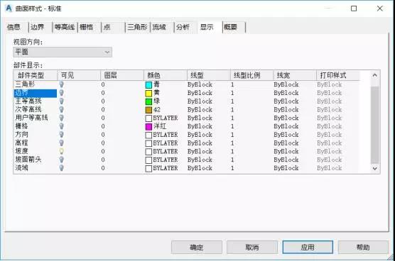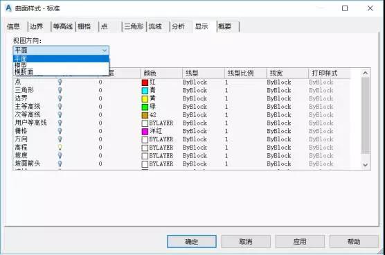 選中要分析的曲面,右擊——曲面特性,找到分析選項(xiàng)卡,可以看到分析類型包含7種,常用的是坡度,高程,坡面箭頭,流域的分析,其他三種大同小異,不做描述。
