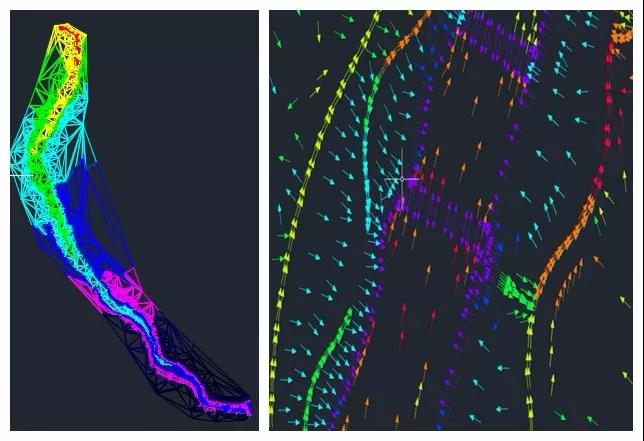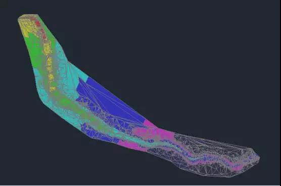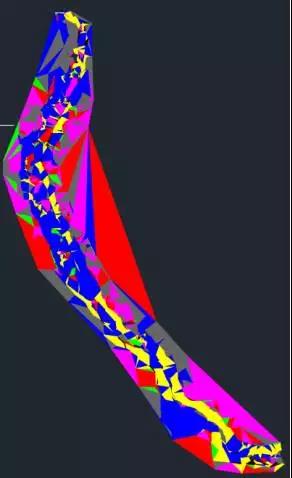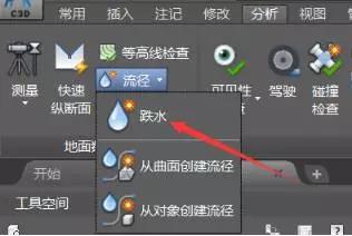 在流域方面,使用曲面三角網(wǎng)線來(lái)表達(dá)的水在曲面上流過(guò)的區(qū)域,跌水即水流經(jīng)曲面的路徑。跌水分析時(shí),鼠標(biāo)在曲面上點(diǎn)擊跌水起點(diǎn)位置,則軟件自動(dòng)生成以該處為起點(diǎn)的跌水路徑。當(dāng)選取多點(diǎn)時(shí),可生成多條跌水路徑。選擇跌水,