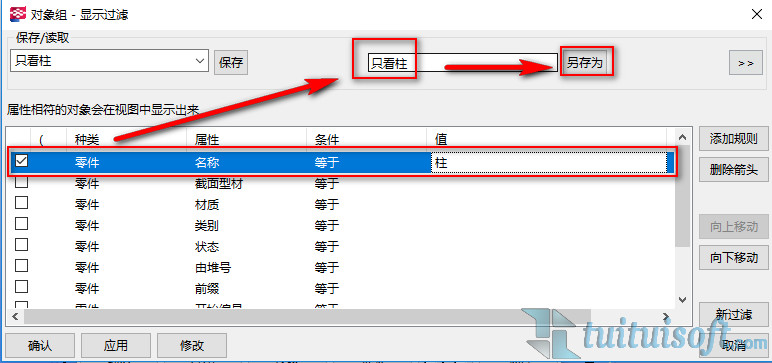 選擇“對象組”之后出現“對象組-顯示過濾”對話框,在這個對話框當中可以通過之前設置的柱屬性對話框當中設置的參數來進行過濾顯示隔離。好比如:這邊選擇的是在“零件-名稱”這欄當中“輸入構件的名稱為柱子”,接著保存這個過濾器并給一個名稱,比如“只看柱”接著點擊“另存為”,最后點擊“修改與應用”