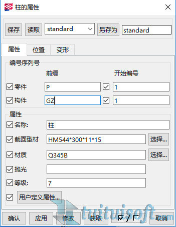 首先給在構件的屬性里編輯對應的參數,比如:柱子的屬性中的名稱、截面型材、材質、等級以及構件、零件的編號等等;比如這里的柱子屬性編輯是這樣的: