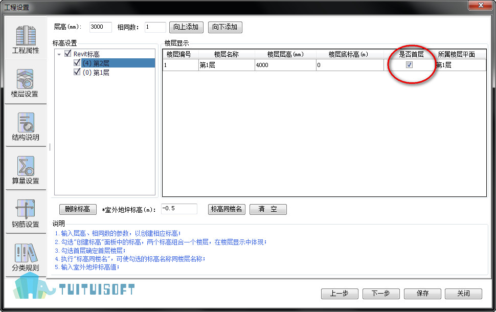 勾選第一層為“首層”根據圖紙雙擊輸入“樓層層高”